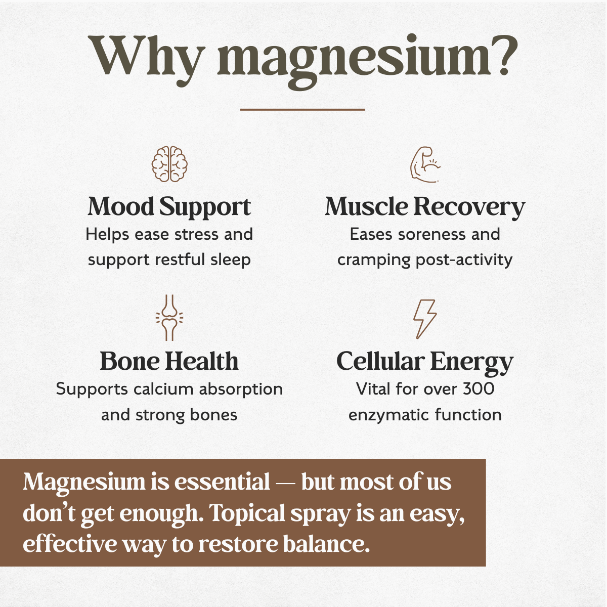 Why Magnesium? Many people are deficient in magnesium, which plays a crucial role in relaxation, stress management, and cognitive function. This easy-to-use spray delivers essential magnesium directly through the skin—no pills required!