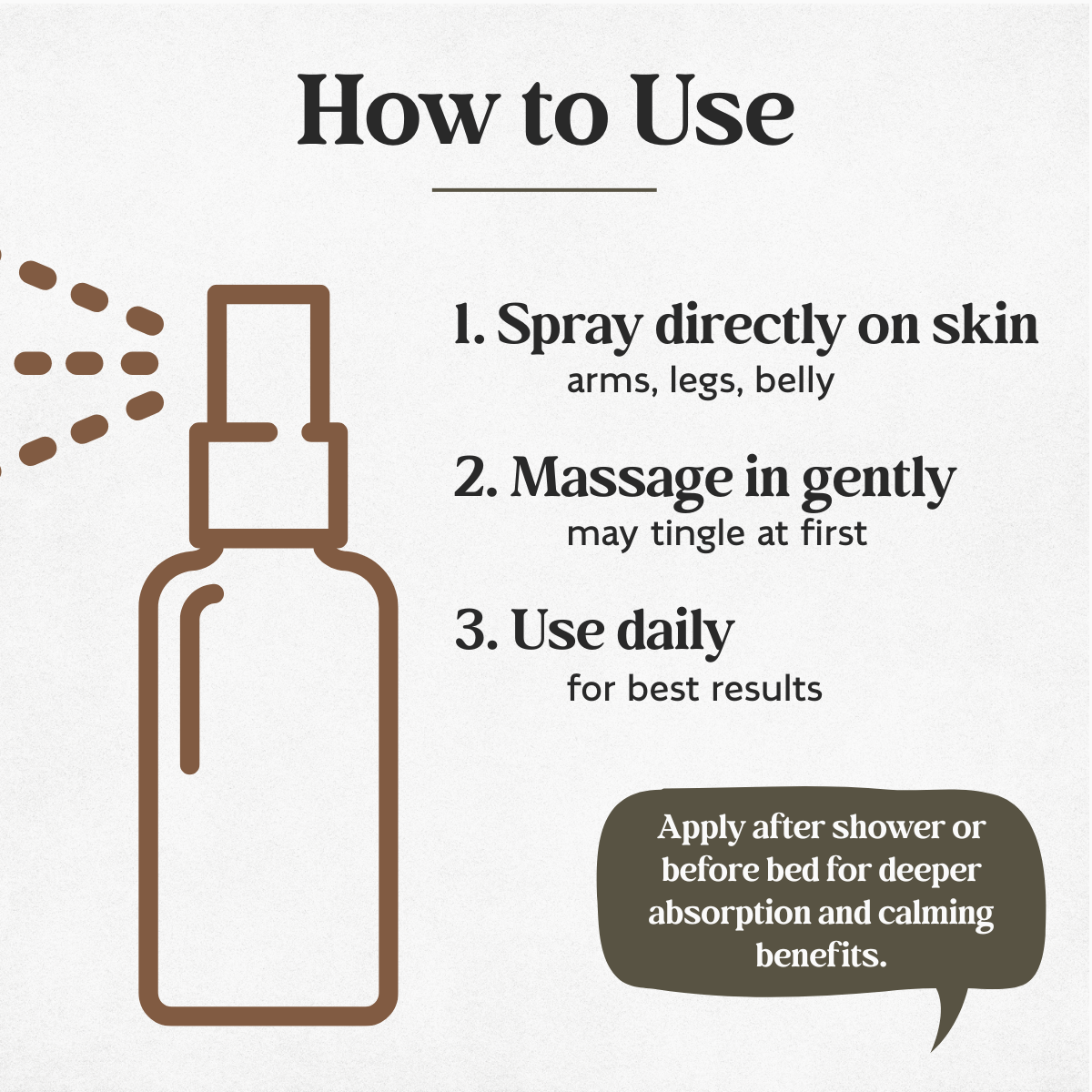 How to Use: Apply to skin daily, especially in areas with muscle or joint pain. Most effective when applied to bottoms of feet (best for sleep), back of the knees, and back of the neck (best for anxiety). May tingle on sensitive skin. Use daily for best results. A slight tingling sensation is normal and fades with consistent use. Do not use on freshly shaved skin! (Trust me. )